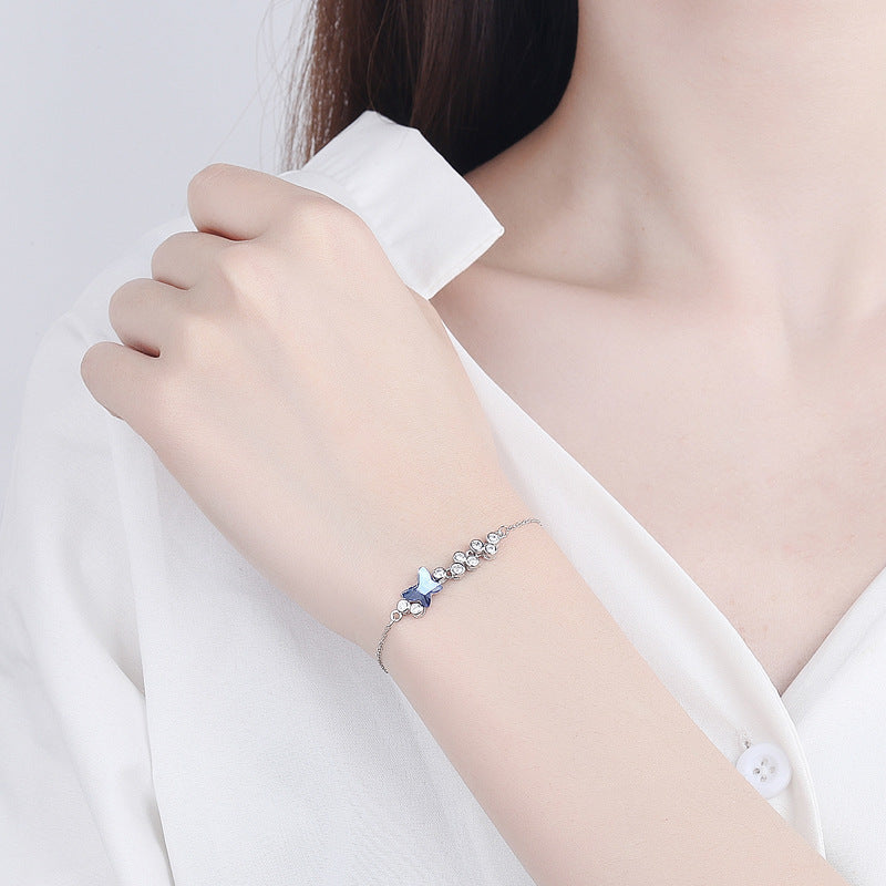A delicate sterling silver bracelet featuring a blue butterfly crystal and zirconia accents, designed for refined everyday wear.